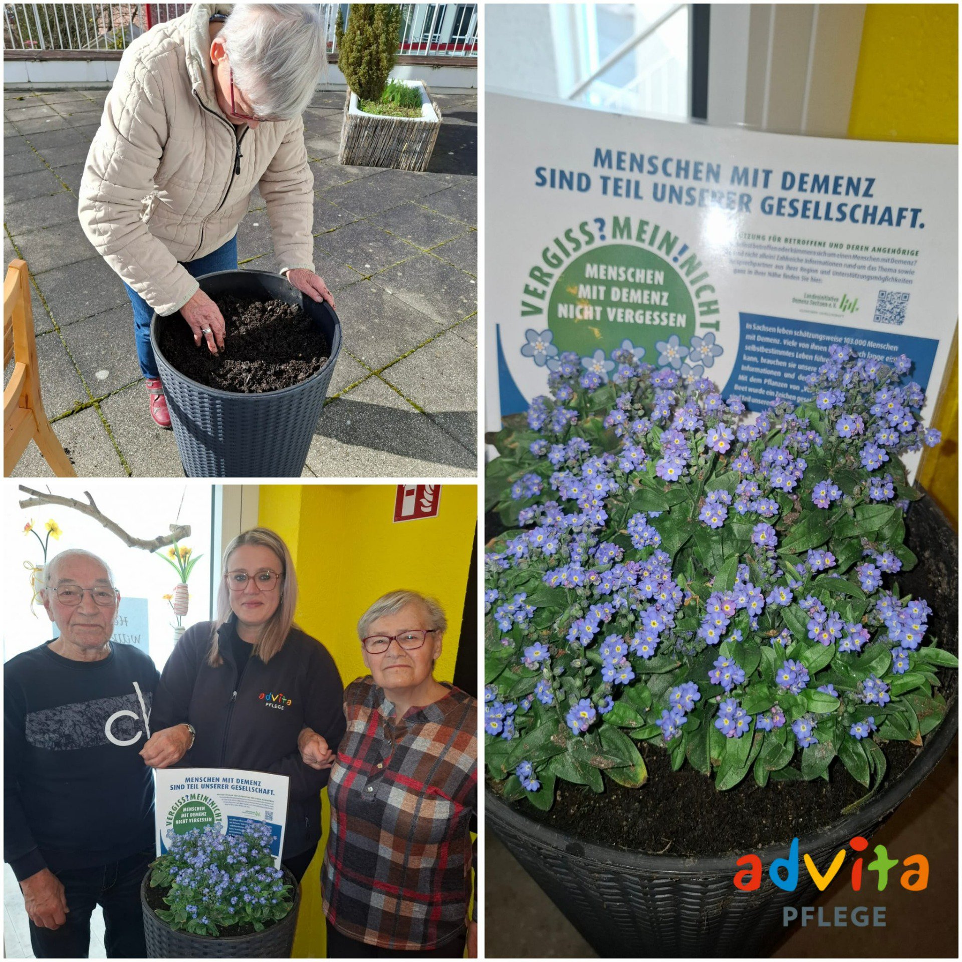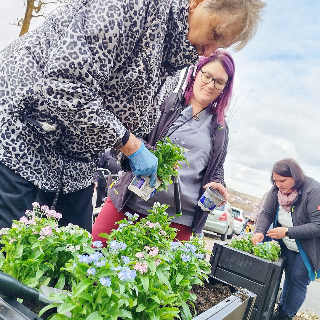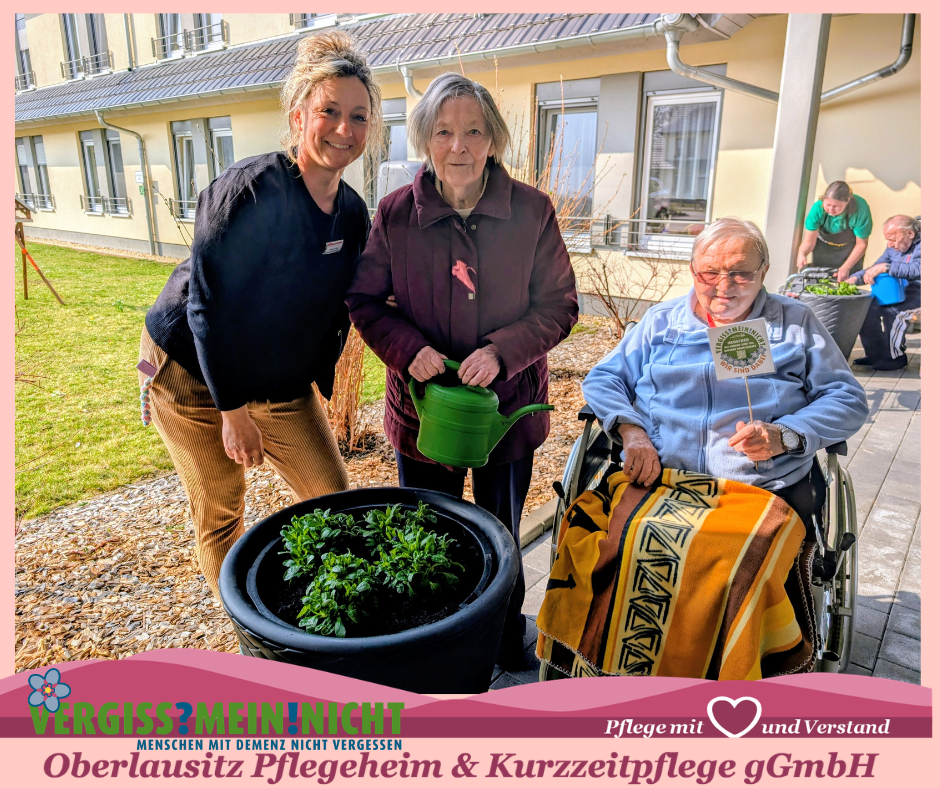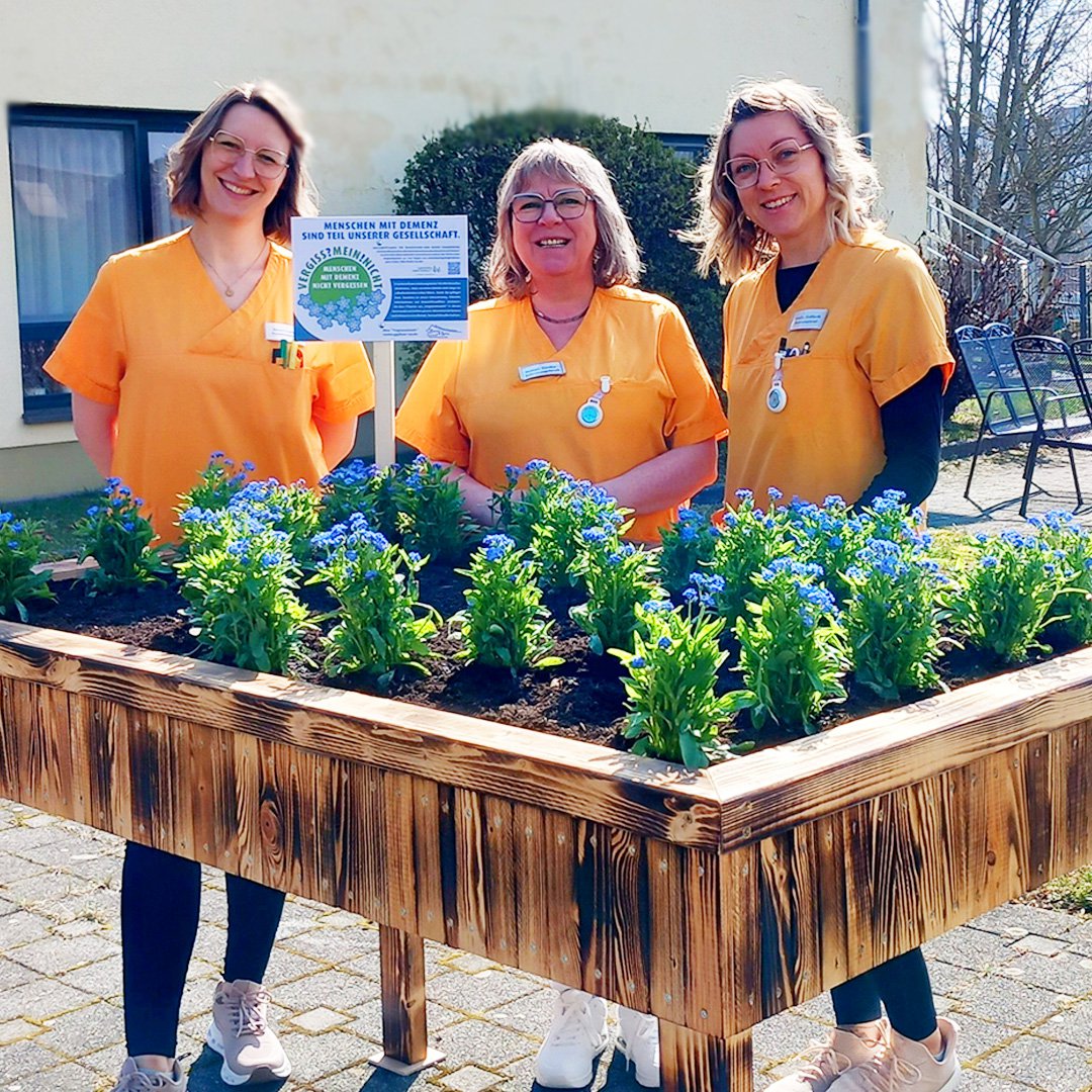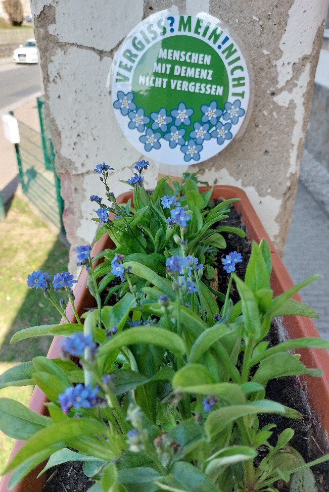 Das Schöne an dieser Aktion ist: Jeder kann sich beteiligen und der Fantasie sind keine Grenzen gesetzt! Angefangen von einer einzelnen Vergissmeinnicht-Pflanze, die am Empfangstresen oder im Wartebereich steht, über einen größeren Kübel im Eingangsbereich bis hin zu ganzen Flächen in Gärten oder im öffentlichen Raum - je nach Platz und Budget kann für Menschen mit Demenz ein Zeichen gesetzt werden. Und nicht nur für sie, sondern auch mit ihnen: Die Hände in herrlich kühler Erde und der Geruch nach Torf wecken Erinnerungen und so kann das gemeinsame Pflanzen ein ausgleichender Moment im manchmal herausfordernden Pflegealltag sein.